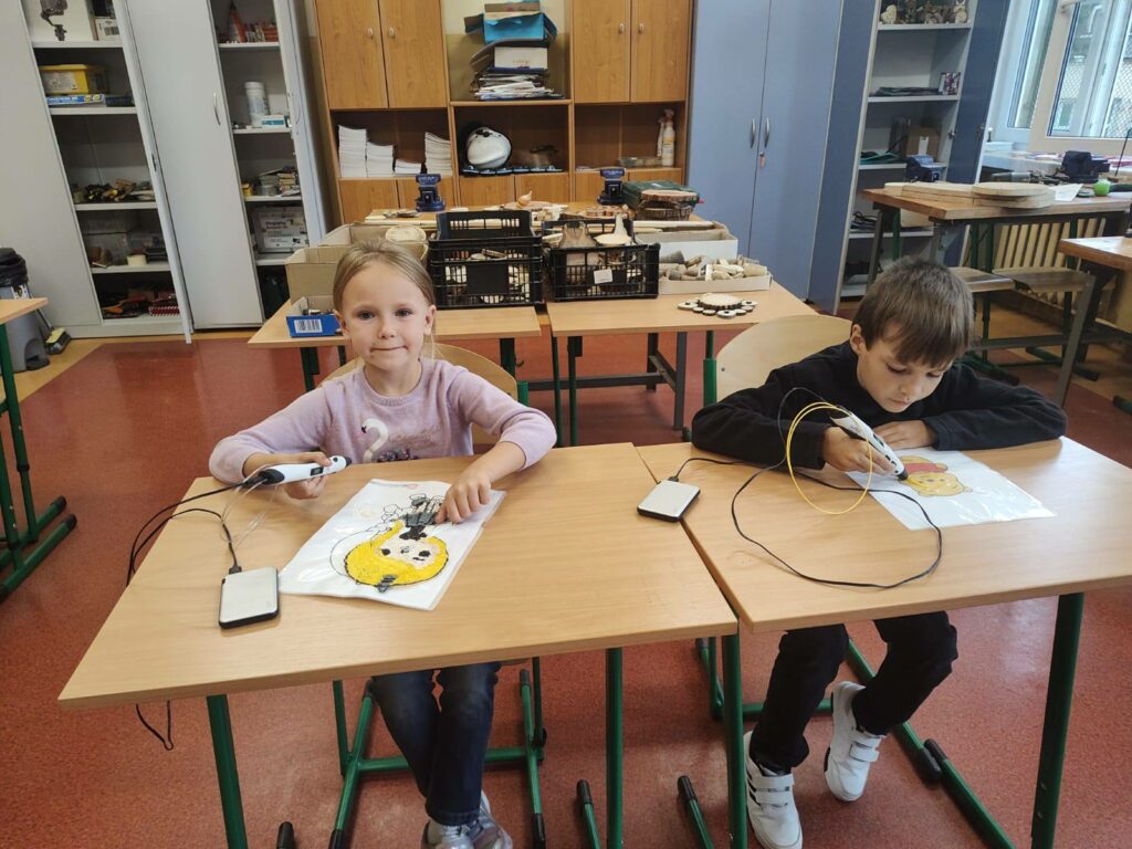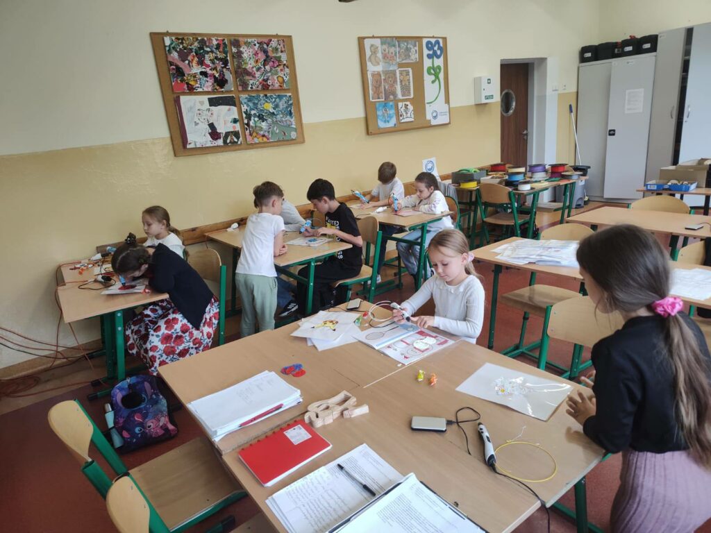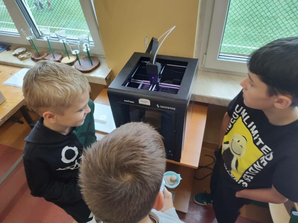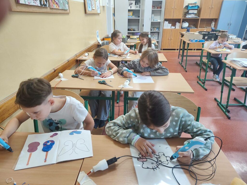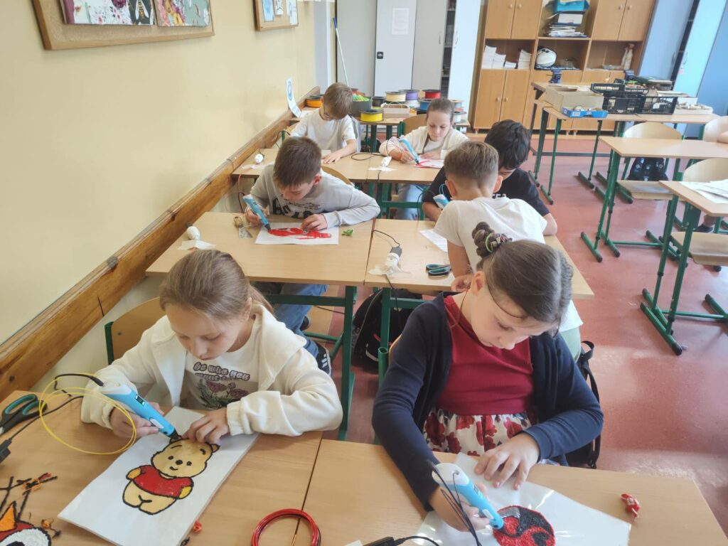 Uczniowie klas 1, 2, 3 doskonale radzą sobie z obsługą długopisów 3D i z bardzo dużym zainteresowaniem obserwują zmagania starszych kolegów z drukarką 3D.
