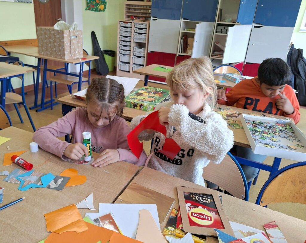 Podczas świetlicowych „Zajęć kreatywnych” często wykorzystujemy materiały „z odzysku”. Dzisiaj stworzyliśmy magnesy na lodówkę i zawieszki: 2 w jednym!