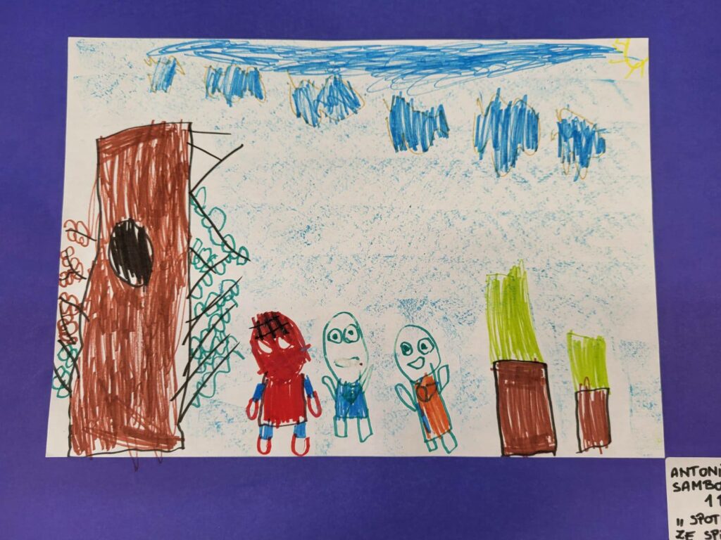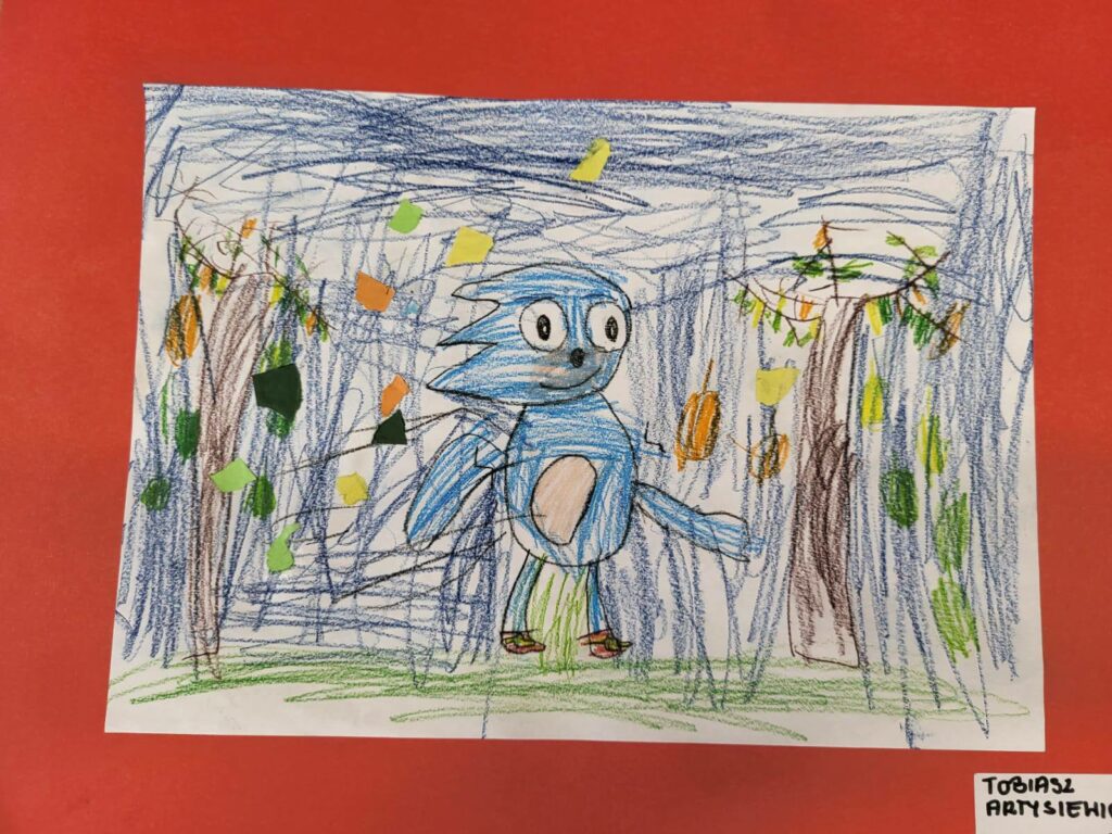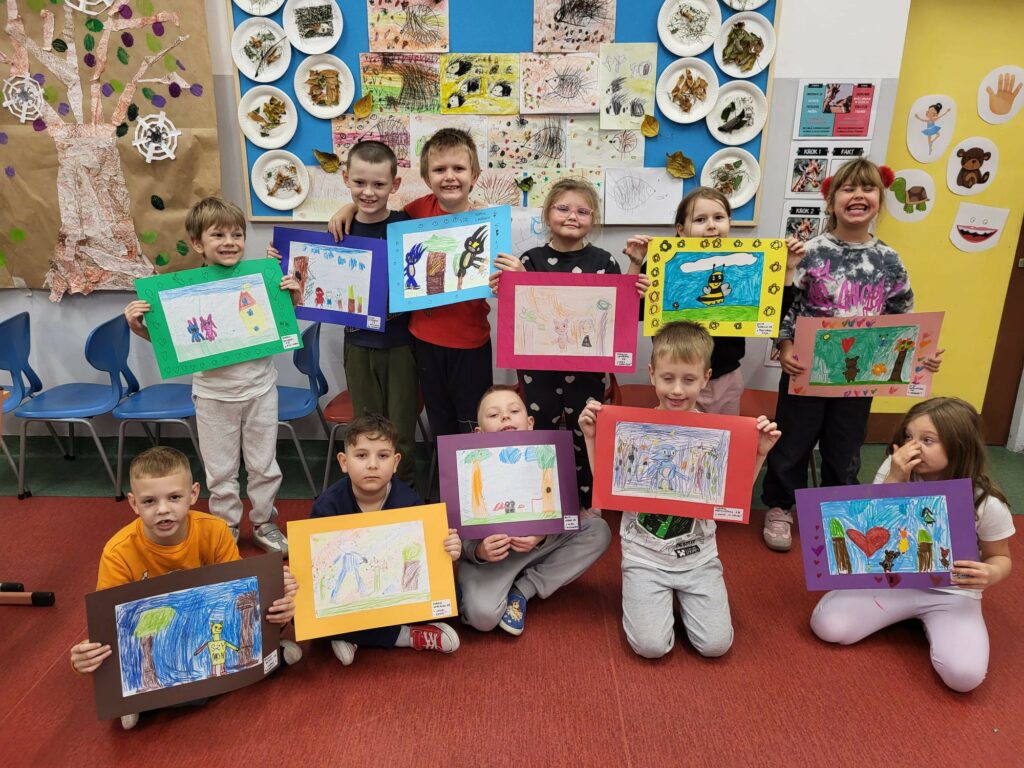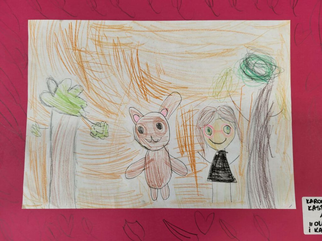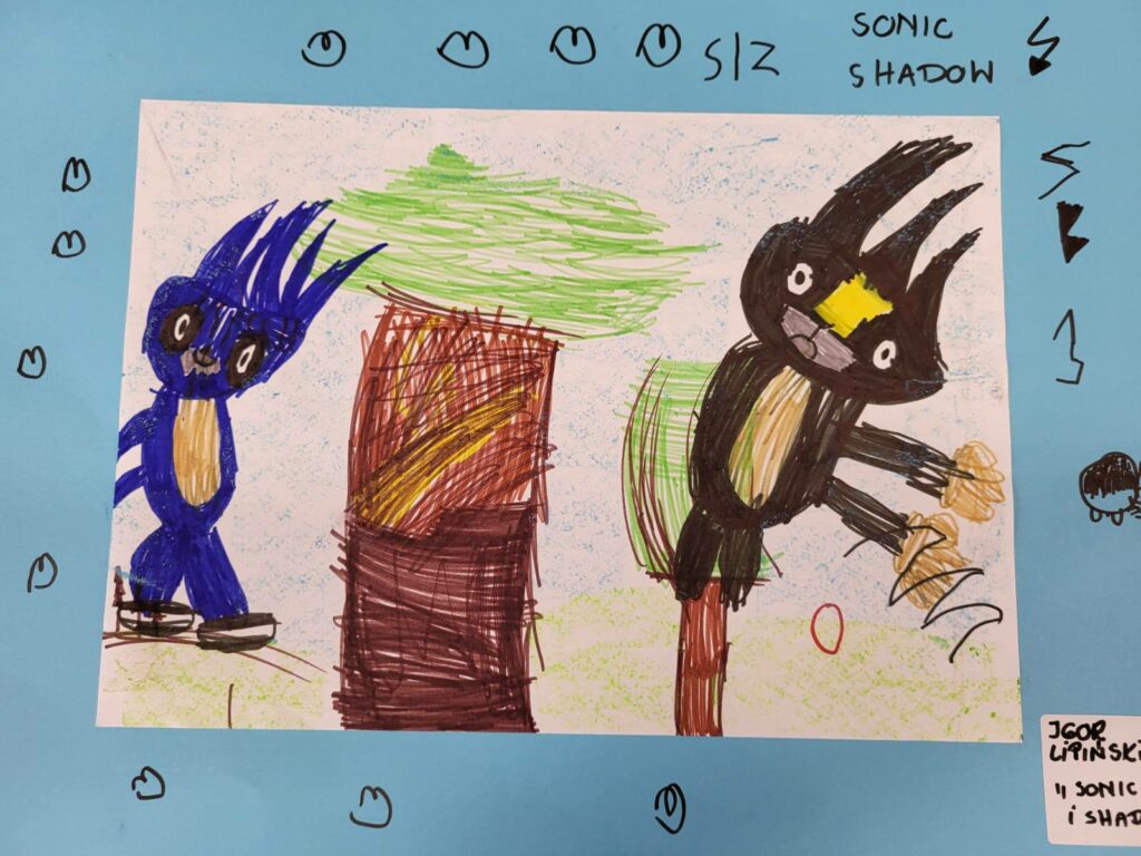 Zadaniem dzieci było przenieść na papier swoje wrażenia. I tak powstały prace na konkurs szkolny „Ulubiona postać z bajki”.