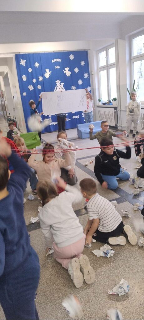 Trochę pozazdrościliśmy śnieżnej aury,więc nie mogło zabraknąć ruchu.Ćwicząc refleks i koordynację ruchową,urządziliśmy własną śnieżną bitwę na przerwie.Zaprosiliśmy klasy 1 a i b oraz 2 a.Było dużo śmiechu i świetnej zabawy.