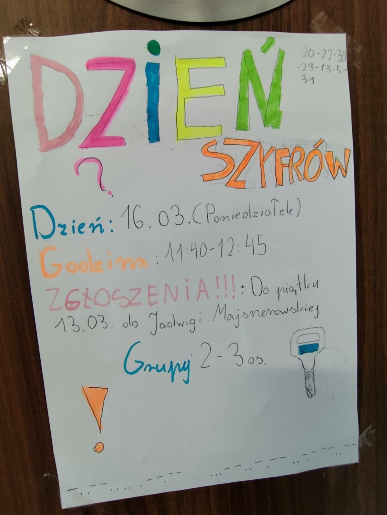 W dniu dzisiejszym (16.03.26), w naszej szkole odbyła się gra terenowa pod nazwą „Dzień Szyfrów”. Uczniowie klas 4-8 zamienili się w łamaczy kodów. W zabawie wzięło udział 14 drużyn i mieli do rozszyfrowania 4 zdania. Grze towarzyszyły duże emocje, bo też stawka była wysoka. Zwycięska grupa pojedzie z organizatorem do Poznania, do „Centrum Szyfrów- Enigma”. Gratulujemy wszystkim, którzy stawili czoła zadaniom, a zwłaszcza zwycięzcom i tym, którzy zajęli drugie i trzecie miejsce!