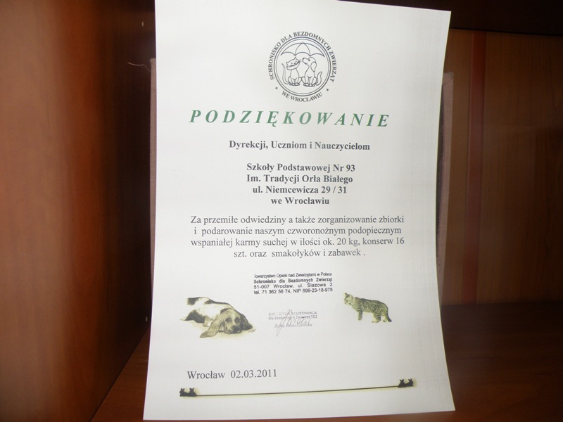 2 marca 2011 r. przedstawiciele Klubu Ekologa pod opieką p .L. Kumali odwiedzili „Schronisko dla bezdomnych zwierząt” . Celem wizyty było przekazanie zebranej w czasie akcji ,,Wigilia dla zwierząt” suchej karmy, konserw, smakołyków i zabawek. Zostaliśmy bardzo miło przyjęci przez P. Dyrektor schroniska, która podziękowała nam za przywiezione prezenty. Zwiedzając schronisko byliśmy pod wrażeniem wielkości boksów dla zwierząt oraz panującej tam czystości i atmosfery. Pracownicy schroniska bardzo dbają o mieszkające tam zwierzęta. Wiktoria Błaszczak |