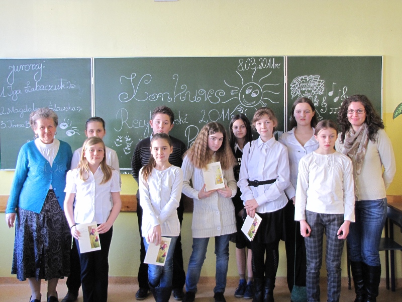 8 marca 2011 r. odbył się Szkolny Konkurs Recytatorski. W tym roku rywalizowało ze sobą dziewięcioro uczniów z klas IV-VI, a ich występy oceniało jury w składzie: p. Teresa Bogusz, p. Magdalena Ślawska, p. Iga Łabaczuk. I miejsce - Gabriela Laskowska, kl. 5 a II miejsce – Joanna Sieradzka, kl. 6 a III miejsce – Marta Kraj, kl. 4 b IV miejsce – Natalia Kopka, kl. 5 a Wyróżnienie: Dominika Gryczewska, kl. 6 b