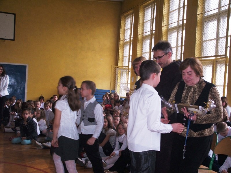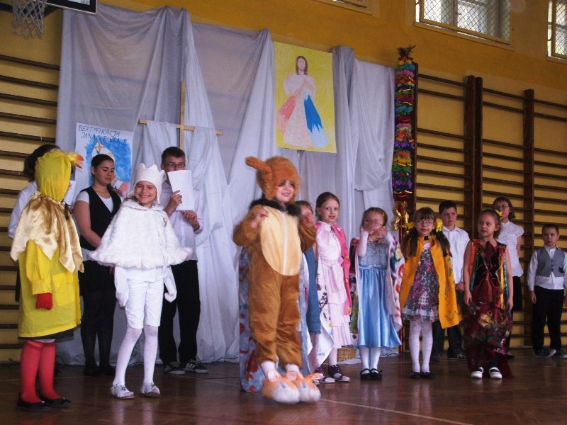 Społeczność naszej szkoły zgromadzona 19.04. br. w szkolnej sali gimnastycznej ,w ramach przygotowań do Świąt Wielkiej Nocy i beatyfikacji wielkiego Polaka Jana Pawła II, obejrzała przedstawienie przygotowane przez uczniów kl. 0 – VIi chór szkolny, pt. „ Droga Zwycięstwa „Śpiewem , tańcem i recytacją tekstów Jana Pawła II o zwycięstwie Chrystusa oraz naszych małych zwycięstwach, przybliżyliśmy sobie prawdę o szczęściu.Życzyliśmy sobie nawzajem samych zwycięstw. W drugiej części spotkania miało miejsce ogłoszenie wyników szkolnego konkursu na palmę wielkanocną i wręczenie wyróżnień oraz dyplomów. Pani wicedyrektor Beata Łopatniuk i O. proboszcz Szczepan Maciaszek wręczyli :wyróżnienie dla uczniów kl. 1b , rodziców i wychowawcy p. D. Gutowskiej za wykonanie największej palmy 2011 i wyróżnienia za palmy wykonane indywidualnie. Dyplomy za udział w konkursie otrzymały wszystkie klasy / 12 z 15 klas w szkole/.W klasach 0-III : pierwsze miejsce uzyskała kl. 3b , drugie kl. 0 a , trzecie 2b. W klasach 4-6 : pierwsze miejsce kl. 4a , drugie kl. 6b , trzecie kl. 5a. Gratulujemy ! Koordynatorzy : Barbara Lach , Iga Łabaczuk.