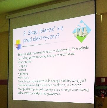 Po tym rozluźniającym wstępie prelegent opowiedział nam o tym: - jak powstaje prąd - jakie są rodzaje elektrowni - jak prawidłowo korzystać z urządzeń elektrycznych - jakie zagrożenia niesie ze sobą prąd - co należy zrobić, gdy ktoś zostanie porażony prądem. Uważam, że takie zajęcia były bardzo potrzebne i pouczające. Julia Szatko