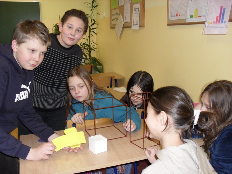 Podczas zajęć wyrównawczych w lutym rozwiązywaliśmy zadania dotyczące figur przestrzennych. Bardzo dokładnie oglądaliśmy modele m. in. prostopadłościanów i sześcianów, a później obliczaliśmy sumy długości ich krawędzi, pola powierzchni i objętości. W marcu rozwiązywaliśmy zestawy zadań powtórzeniowych, przygotowując się do sprawdzianu szóstoklasisty.