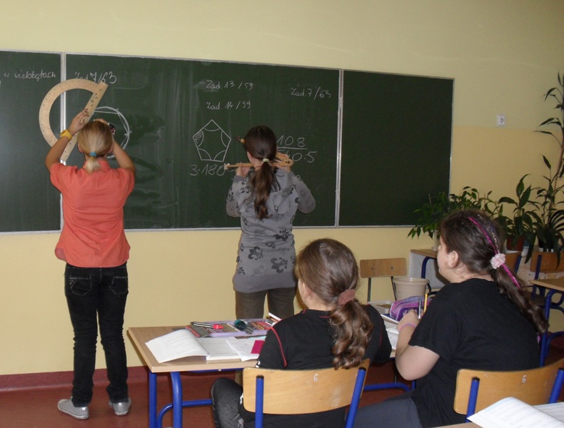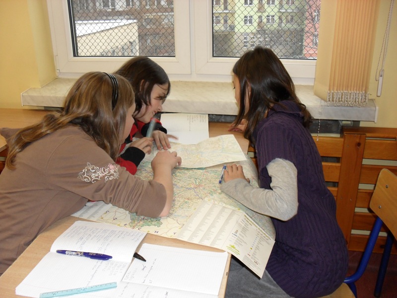 Podczas zajęć wyrównawczych w grudniu rozwiązywaliśmy zadania dotyczące skali na planach i mapach. Przeliczaliśmy skale liczbowe na mianowane, odczytywaliśmy, co oznaczają podziałki liniowe. Obliczaliśmy rzeczywiste odległości różnych miejsc znajdywanych przez nas na planie Wrocławia (np. odległość od szkoły do Placu Solnego), na mapie Dolnego Śląska (np. odległość między Wrocławiem a Strzelinem) oraz na mapie Polski. W styczniu rozwiązywaliśmy zestawy zadań powtórzeniowych, dotyczących m.in. wykonywania obliczeń pieniężnych, korzystania z informacji zawartych w cennikach, różnych ofertach i zestawieniach.