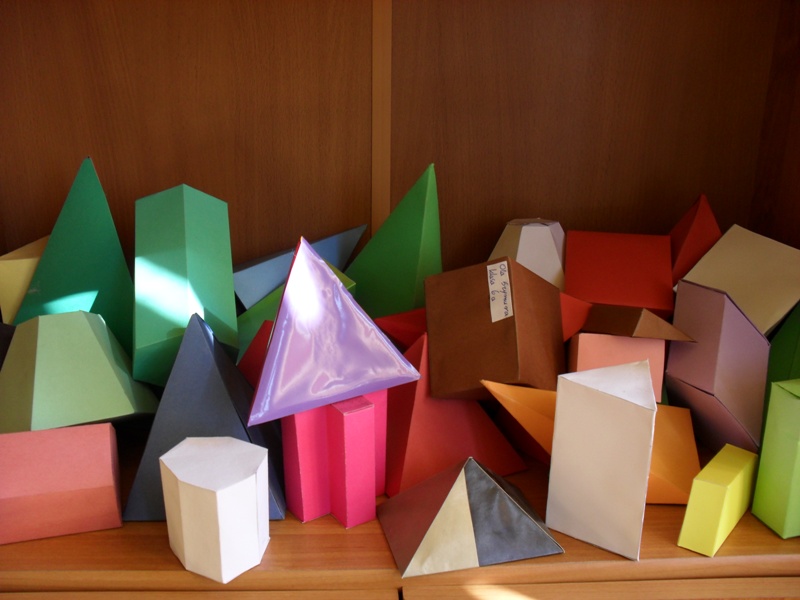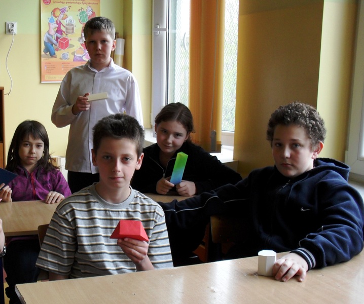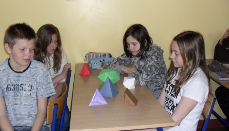 Podczas zajęć wyrównawczych w kwietniu podsumowaliśmy swoje wiadomości o figurach przestrzennych. Wykonywaliśmy modele graniastosłupów, ostrosłupów, a niektórym z nas udało się wykonać modele innych, bardzo ciekawych wielościanów (ich siatki wyszukali samodzielnie w Internecie). Sporo tych brył zrobiliśmy - będą pomocą w nauce geometrii dla piątoklasistów.