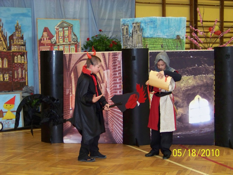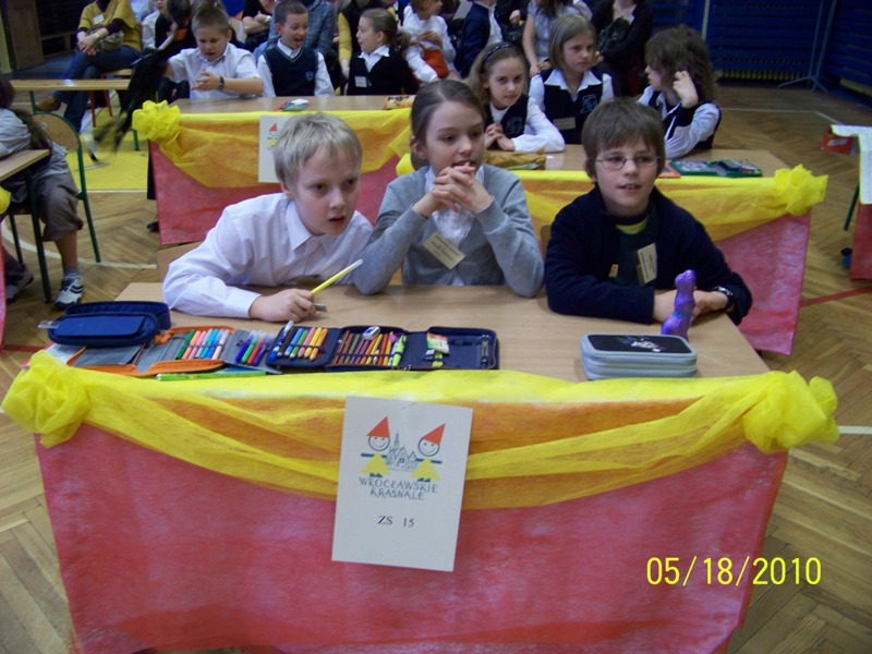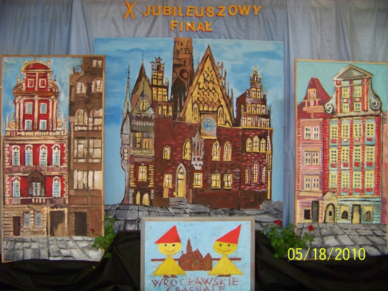 18 maja 2010 roku w Szkole Podstawowej nr 93 im. Tradycji Orła Białego już po raz trzeci spotkali się finaliści konkursu „Wrocławskie krasnale”, organizowanego dla pierwszego poziomu kształcenia. Baśniowo piękna scenografia świetnie harmonizowała z treściami konkursu. X jubileuszowy konkurs otworzyła pani dyrektor Jolanta Sawicka. Powitała serdecznie zaproszonych gości, m.in. przedstawicieli TMW, UTW, RR, rodziców i nauczycieli, a przede wszystkim uczestników, którym życzyła samych poprawnych odpowiedzi i najpiękniejszych występów. Podczas konkursu drużyny musiały wykazać się wiedzą o Wrocławiu, a następnie w ciągu 5 minut zaprezentować inscenizację jednej z wrocławskich legend. Ich zmaganiom sędziowała komisja, w skład której weszli przedstawiciele KO, CDN., TMW oraz nauczyciele. Nie było to łatwe zadanie, gdyż wszystkie drużyny prezentowały wysoki poziom. Kiedy komisja obradowała , uczestnicy oraz goście zostali zaproszeni na poczęstunek, poczęstunek także obejrzeli występy artystyczne uczniów naszej szkoły. Tegorocznym zwycięzcą konkursu „Wrocławskie Krasnale” została drużyna z Szkoły Podstawowej nr 1 im. Marii Dąbrowskiej we Wrocławiu. Miłym akcentem jubileuszowego finału było wręczenie dziewięciu nauczycielkom srebrnej odznaki TMW, za aktywność w realizacji konkursu „Wrocławskie Krasnale”. |